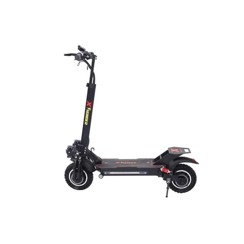 Электросамокат WS-Thunder 2400W 48V21ah - достойный представитель городского экологического транспорта. Производители оснастили данную модель производительными моторами суммарной мощностью 2400 W, которые позволяют развивать впечатляющую скорость до 50 км/час. Полный привод обеспечивает хорошую проходимость и возможность преодолевать подъемы и небольшие препятствия на пути. Во время движения по ровным городским улицам полный привод можно отключить, что уменьшит расход аккумуляторной батареи. 10-дюймовые колеса с глубоким протектором обеспечивают хорошее сцепление с дорожным покрытием, позволяя сохранять устойчивость при движении и маневрировании. Электросамокат выполнен из прочного алюминиевого сплава и выдерживает нагрузку до 155 кг, вес самого устройства при этом составляет 29 кг. Складная конструкция делает электросамокат более компактным и удобным для хранения и транспортировки. Маленькие колесики в передней части платформы позволяют катить самокат в сложенном виде, не поднимая его полностью. Система освещения включает три элемента в передней части электроскутера (основной фонарь посередине и два дополнительных по бокам), а также три габаритных огня сзади. На боковой части платформы расположена светодиодная подсветка, которая делает электроскутер более заметным в темное время суток.