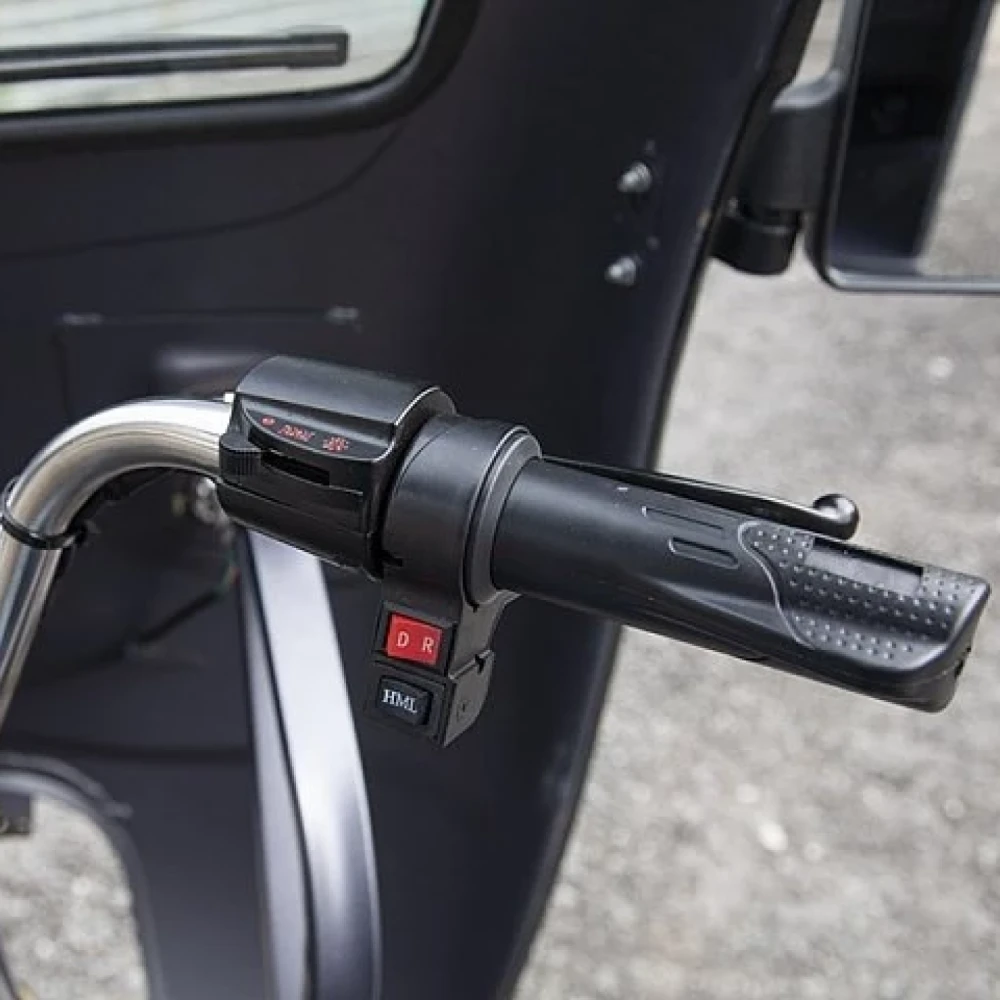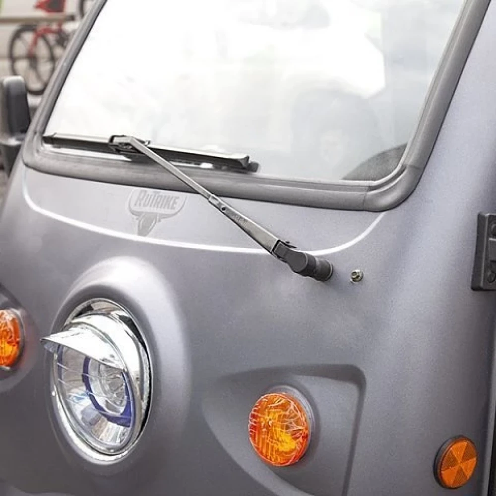 Несомненным достоинством модели является закрытая кабина и наличие прочной крыши. Подобная особенность позволяет использовать технику при любых погодных явлениях. Утолщенное лобовое стекло надежно защищает от ветра. Свободное прохождение препятствий на дороге возможно благодаря усиленным передним и задним амортизаторам.